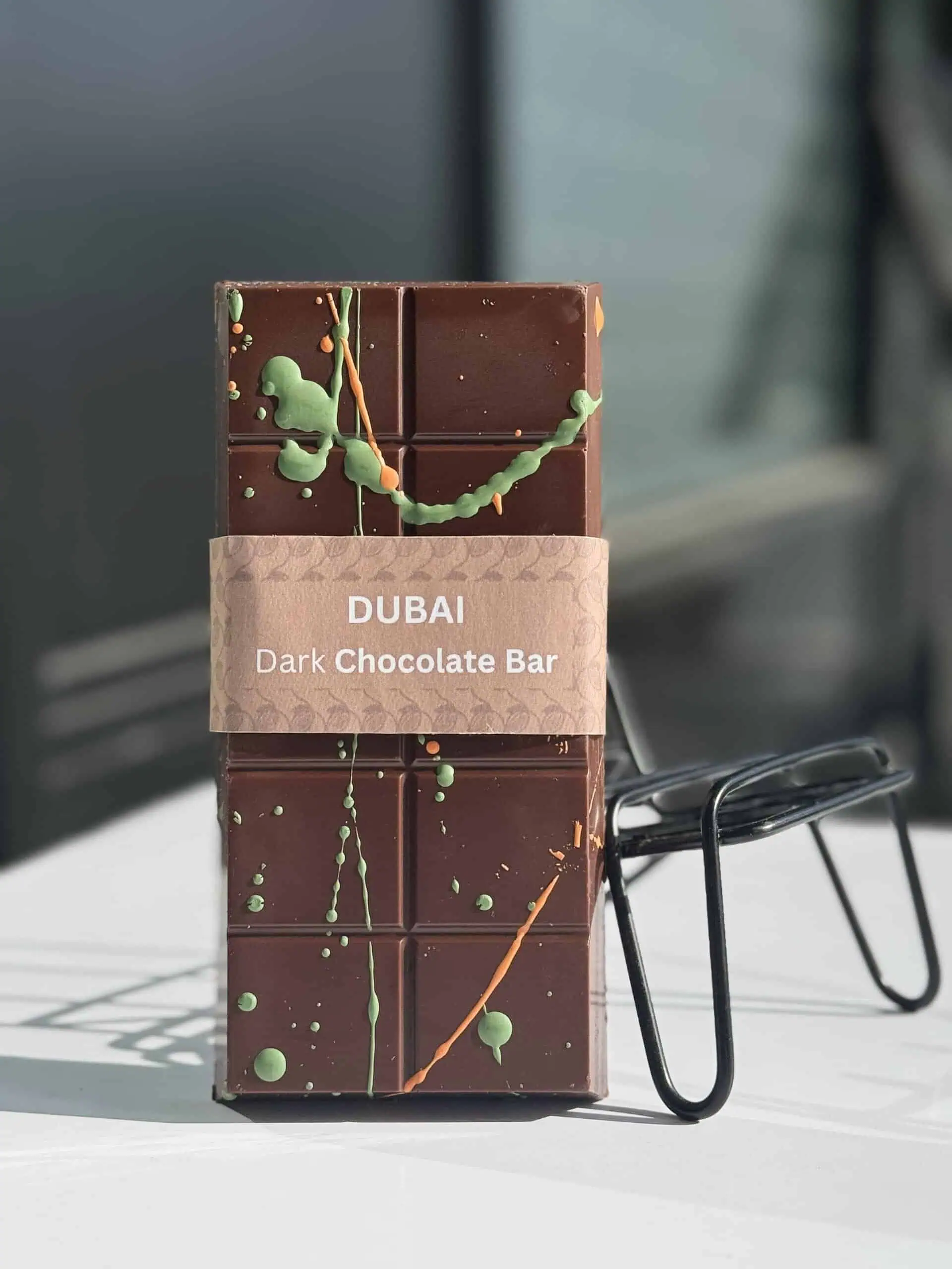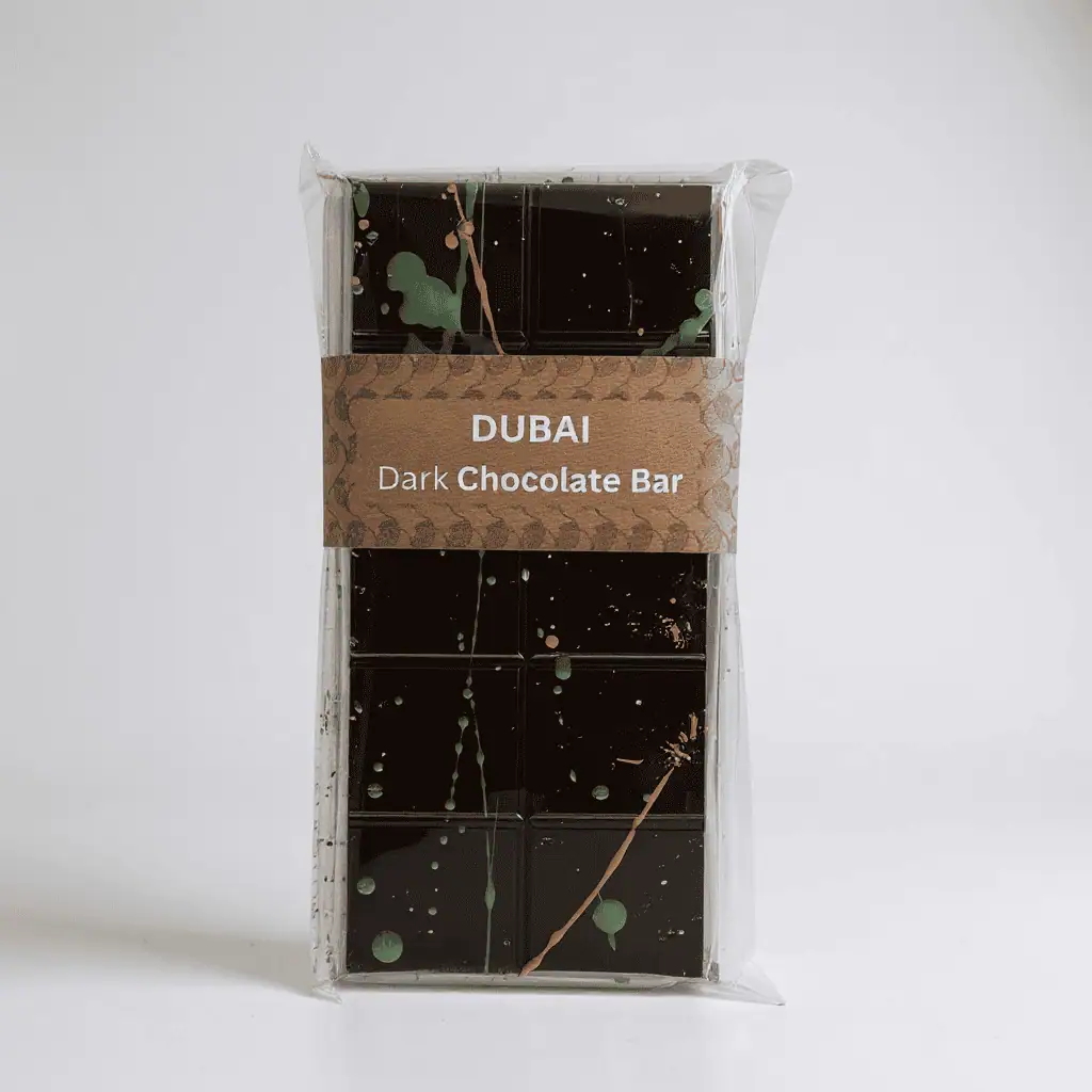 The artistry continues with the presentation of the bar. The outside is decorated with bright splashes of golden yellow and emerald green. This reflects the lush landscapes and lively markets of the Middle East. These hand-applied touches suggest the tasty treat inside. They promise an experience that is pleasing to both the eye and the taste. The bar is wrapped in a clear cover to keep it fresh and maintain its great texture. It is finished with a paper band that says, “DUBAI Dark Chocolate Bar.”